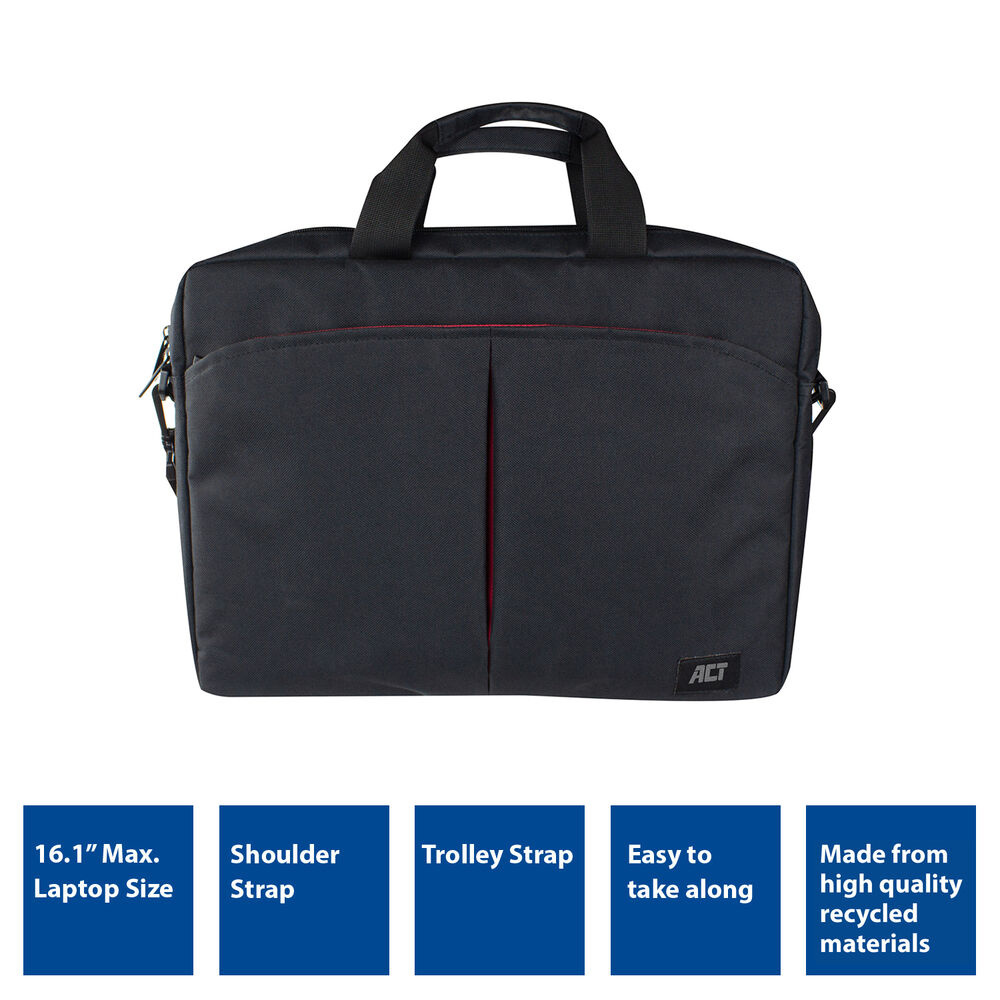 Bescherm je laptop onderweg met de ACT AC8505 City schoudertas voor laptops tot 16,1 inch. Het stevige laptopvak beschermt je notebook tegen krassen en beschadigingen. De tas heeft extra vakken voor het opbergen van je tablet, stroomadapter, muis en andere spullen. Neem de laptop overal mee naartoe dankzij de comfortabele grip, afneembare schouderriem en trolleybevestiging. De tas is gemaakt van waterafstotend rPET materiaal: gerecyclede plastic flessen.