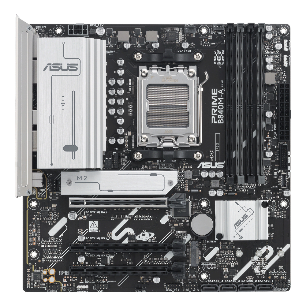 Dit ASUS PRIME B840M-A-CSM moederbord is een mATX moederbord en ontworpen voor het AM5 platform. Met 4 DDR5 geheugenslots, ondersteuning voor maximaal 192 GB RAM en 3 M.2 slots biedt dit moederbord uitstekende prestaties en opslagcapaciteit. Het heeft 1 PCIe 4.0 x16 en 2 PCIe 3.0 x16 slots, waardoor gebruikers kunnen profiteren van de nieuwste grafische kaarten en uitbreidingskaarten.