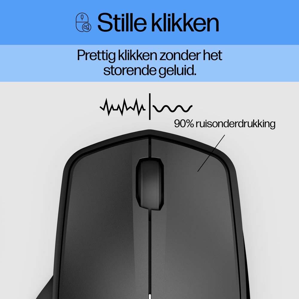 Werk de hele dag door met de HP 280 Silent Wireless Mous, een draadloze muis die verbonden blijft. Laat niets je productiviteit verstoren met een comfortabel ergonomisch ontwerp en een batterijduur van tot 18 maanden. Met een unieke stille klikfunctie kun je genieten van datzelfde klikgevoel zonder al het lawaai. Met HP Blue Optical Technology kun je op elk oppervlak werken, wanneer je maar wilt en genieten van een betrouwbare verbinding met een 2,4GHz draadloze dongle. Bewaar de dongle in de muis als je onderweg bent. Het is perfect te gebruiken in elke ruimte.