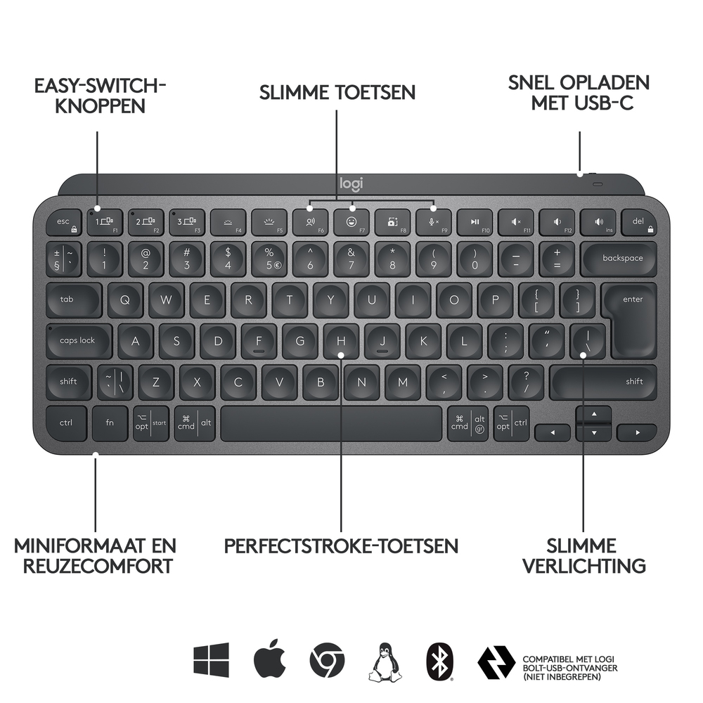 De Logitech MX Keys Mini Draadloos QWERTY Grafiet is een compact toetsenbord dat werkt met Windows en macOS. Het toetsenbord beschikt namelijk over Windows en Mac toetsen. Het toetsenbord gebruik je uiteraard draadloos. Voor opladen gebruik je de meegeleverde usb C kabel. De verlichting in het toetsenbord past zich automatisch aan naar het omgevingslicht. Liever zelf regelen, dan doe je dit met de F4 en F5 toets. Verbinden gaat gemakkelijk via bluetooth of via de (los verkrijgbare) Logi Bolt usb receiver.