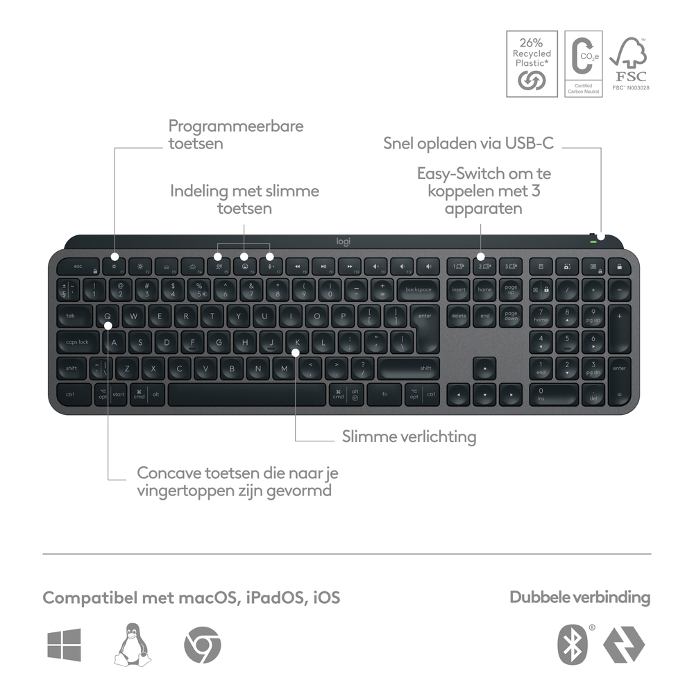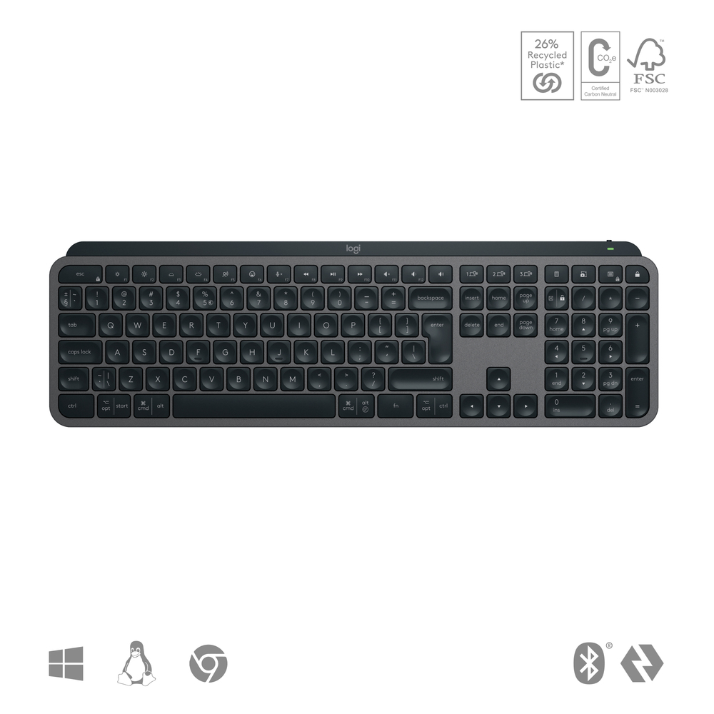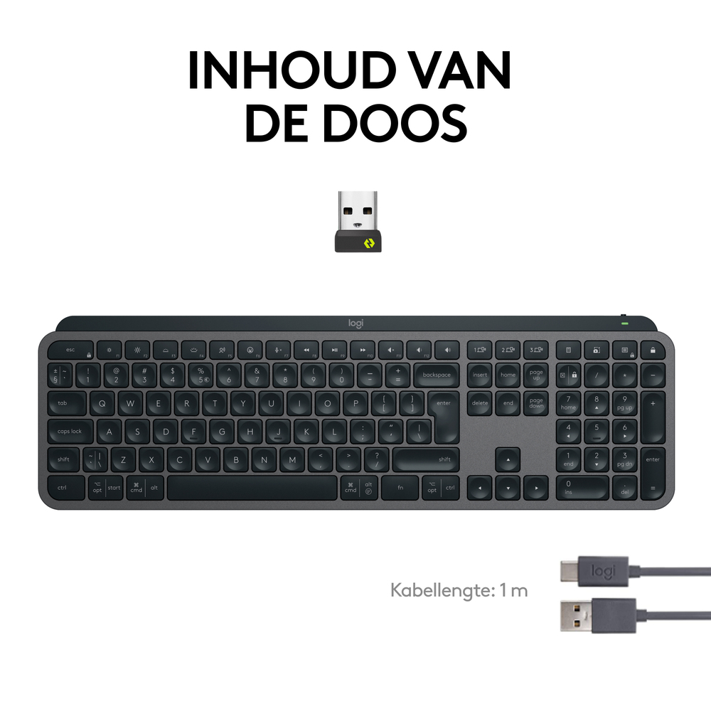 Dit toetsenbord is volledig draadloos. Zo plaats je het op de gewenste positie van jouw bureau, maar neem je het net zo eenvoudig mee als je buiten de deur moet werken. De verbinding maak je via bluetooth en de Logi Bolt-ontvanger die je in je laptop steekt. Het voordeel is dat de MX Keys S compatibel is met diverse besturingssystemen, zoals Windows, macOS, ChromeOS, Linux en iPadOS. Als laatste werk je tot 10 dagen door op een volle lading. Is de batterij toch leeg? Met de meegeleverde USB-C-kabel laad je hem tijdens het werken tussendoor op.