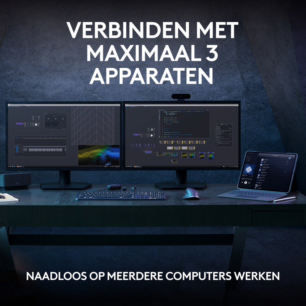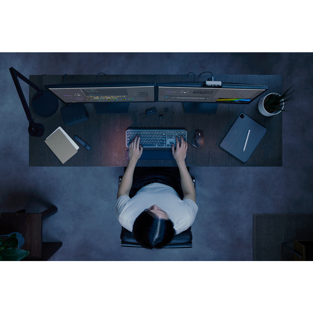 Van een verslag typen tot multitasken in meerdere programma’s: als je lang aan het werk bent, is het belangrijk dat er genoeg comfort voor jouw handen is. Daarom heeft dit Logitech-toetsenbord een ergonomisch design. Het heeft comfortabele, concave toetsen en een lichte verhoging, waardoor jouw vingers en pols in een natuurlijke houding blijven. Daarnaast beschikt het over verlichte toetsen. Deze lichten op zodra je met je handen in de buurt van het toetsenbord komt. Erg handig als je tot laat in de avond nog even door moet werken of gamet. De verlichtingsduur en helderheid bepaal je in de Logi Option+-app.
