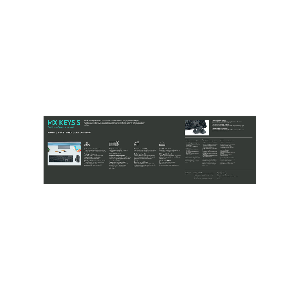 Werk comfortabeler en productiever met het draadloze Logitech MX Keys S-toetsenbord in grafiet. Dit ergonomisch ontworpen accessoire met verlichte toetsen beschikt over handige taken en acties, zeker dankzij de Logi Options+-app, en is compatibel met diverse besturingssystemen.